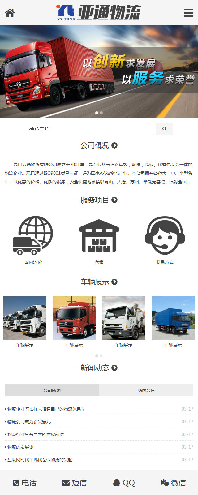 昆山亚通物流有限公司成立于2001年,是专业从事道路运输,配送,仓储、代客包装为一体的物流企业。现已通过ISO9001质量认证,评为国家AA级物流企业。 本公司拥有各种大、中、小型货车,以优惠的价格、优质的服务,安全快捷地承接以昆山、太仓、苏州、常熟为基点,辐射全国各地区的货运业务。并在全国主要大中城市设有办事处,为确保货物的交通安全,我司由平安保险全程承保。